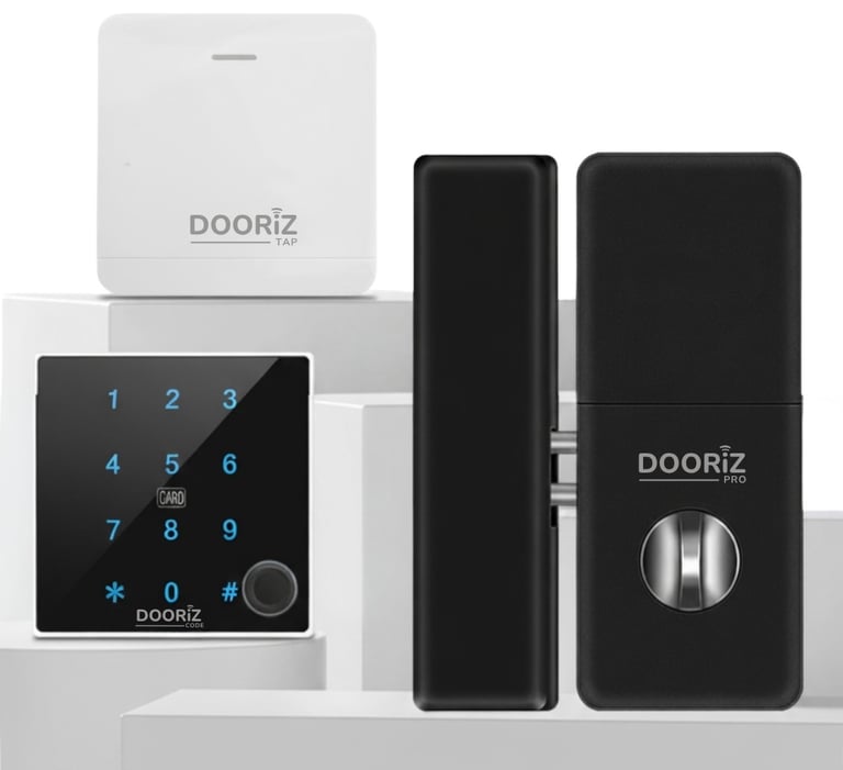 Accesorios inteligentes de apertura local, en el interior (Dooriz TAP) y exterior (Dooriz CODE) de la puerta. El mando a distancia Dooriz KEY funciona tanto en el interior como exterior de la puerta.